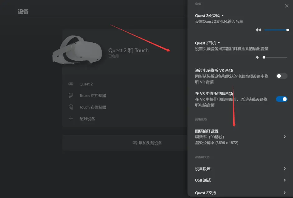 点击设备中的Quest2和Touch进入设备设置。我们主要关注其中的画质偏好设置。