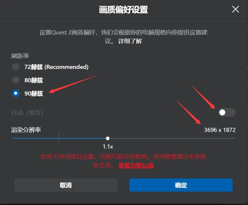 其中刷新率,如果你显卡配置不高,请维持在72hz,如果你显卡较高,可以直接开到90hz,体验更丝滑的游戏体验。然后是下方的渲染分辨率设置。手动设置可以最高推到1.7倍,设置渲染分辨率为5408×2736。但是实际其实这才是到真正的1:1应用与显示的像素比,而不是超采分辨率。